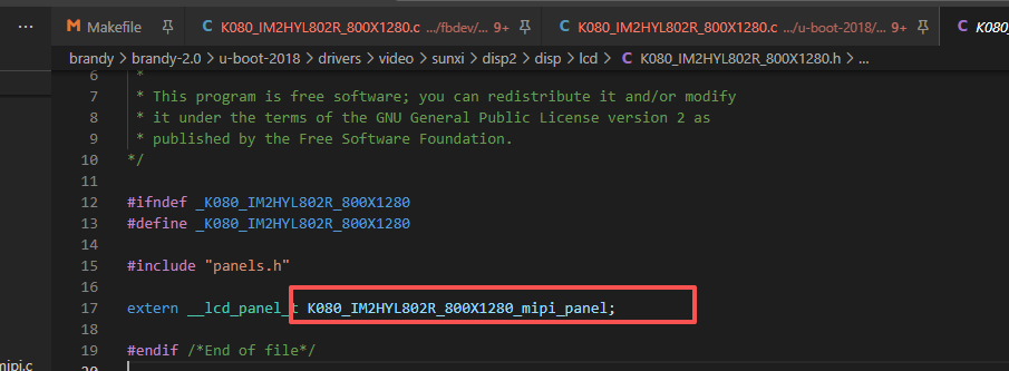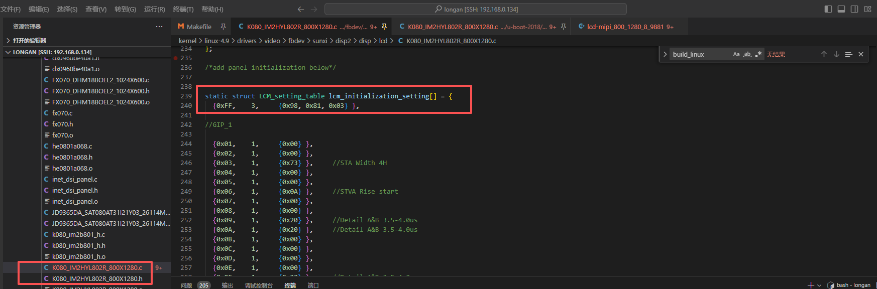 2.在/home/yztiot/systemCode/A133/A133_PLUS_androidQV1.1/longan/kernel/linux-4.9/drivers/video/fbdev/sunxi/disp2/disp/lcd/中找到相同配置没有使用过的文件(没有.o和。su文件的),根据初始化代码修改.h和.c里面的内容,如下图初始化代码和相对应的文件