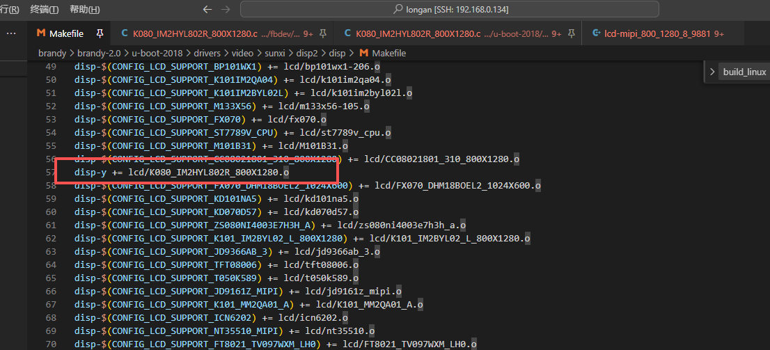 3.修改完成后在/home/yztiot/systemCode/A133/A133_PLUS_androidQV1.1/longan/brandy/brandy-2.0/u-boot-2018/drivers/video/sunxi/disp2/disp/Makefile找到对应的文件名改成y
